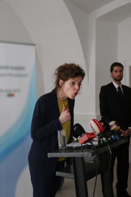 Die Kameras beginnen aus der Rolle zu fallen. Sie machen Detailaufnahmen von meinen Gebärden, tasten den Raum und die JournalistInnen ab. Die Gemachtheit der Szenerie wird so einerseits thematisiert und ermöglicht, durch das negieren des klassischen Fernseh-Kamerablicks, subjektivierte Narrative.