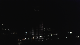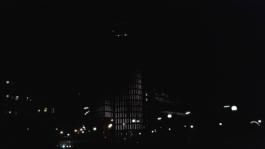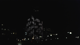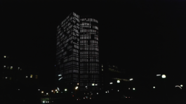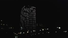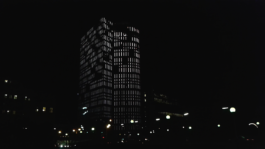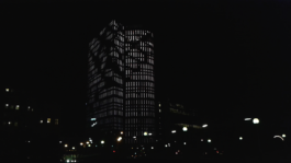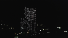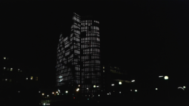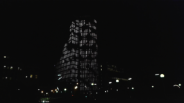 Stück für Stück baut sich die Glasfassade mit Ziegelsteinen auf, um dann in sich zusammen zu fallen - um sich erneut - aus einer Staubwolke aufzubauen.